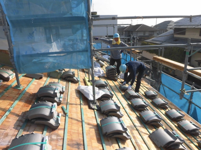 下屋瓦上げ12,30 2014.12.30 先代の足あと 今日は屋根屋さん今年最後の現場仕事です。 瓦の数が多い為に一回では運べない為3回 に分けて搬入之が最後の荷揚げです。 これで来年早々作業に取り掛かれます。 今年も色んなかたにお世話になり有難う御座いました。 来年も宜しくお願いします。皆さま良いお年おお迎え下さい。