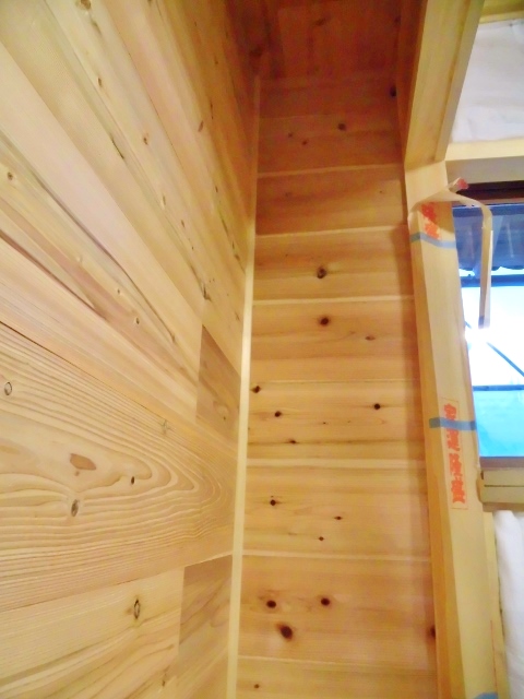 洋間物入れ完成2,06 2015.02.06 先代の足あと 今日は大変寒い一日でした。 外は寒いのですが家の中は 良いムードになっています。 大工の菅村が手掛けていた 杉無垢材で貼って作っていた 洋間物入れ完成です。