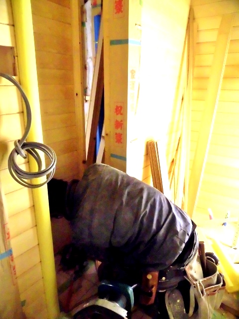 洗面 ヒバ 貼り 2,09 2015.02.09 先代の足あと 今日は大変寒い一日でした。この寒い中大工 田中洗面 ヒバ 貼りに精を出しています。後少しで完了です。洗面室の中は ヒバ の良い香りで一杯です。