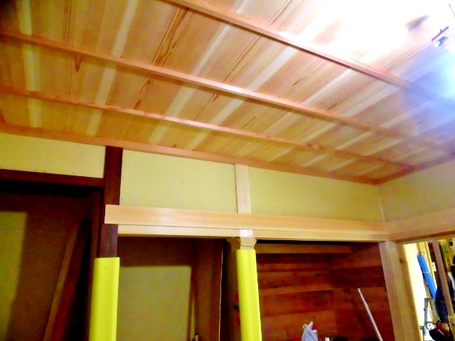 壁貼り初日2,16 2015.02.16 先代の足あと 今日の相変わらず寒い一日でした。 この寒い中大工さん追い込みに入っています。 今日から壁の P、B 貼りに取り掛かりました。 この化で貼りが終わると左官さんの登場になります。