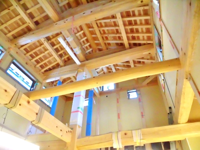 リビング吹き抜け全貌2,20 2015.02.21 先代の足あと 今日は朝からリビングふぃ気抜け部の大工足場の撤去の作業から始まりました。この絵がリビング吹き抜け部の全貌です。予想道理の仕上がりです。やはり本格木造良い感じです、この後左官さんの出番です。
