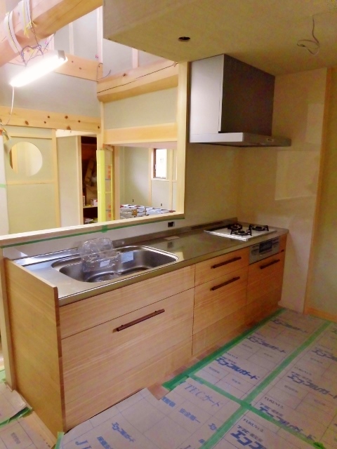 手造りキッチン取り付け3,07 2015.03.07 先代の足あと 今日は数日前より制作していた手造りキッチン取り付け完了です。 前面は タモ 無垢材 裏板は天然乾燥させた 杉板 を使用です やはり 無垢材 良い香りと手触り最高です感じに仕上がりました。
