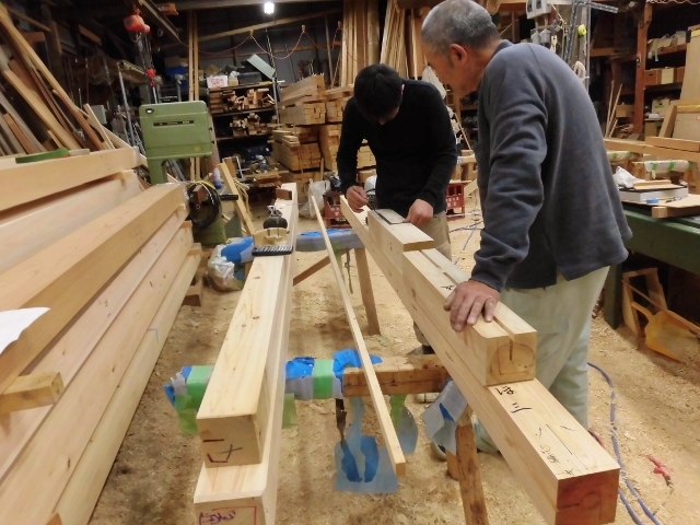新 旧 技術 継承 5,01 2015.05.01 先代の足あと 今日から5月始まりです。モジ通り皐月晴れの最高のお天気でした。 この気持ちの良い天気の中門改修工事の墨付け作業菅村大工 ベテラン大工の井桜さん技術の継承上手く出来ています。