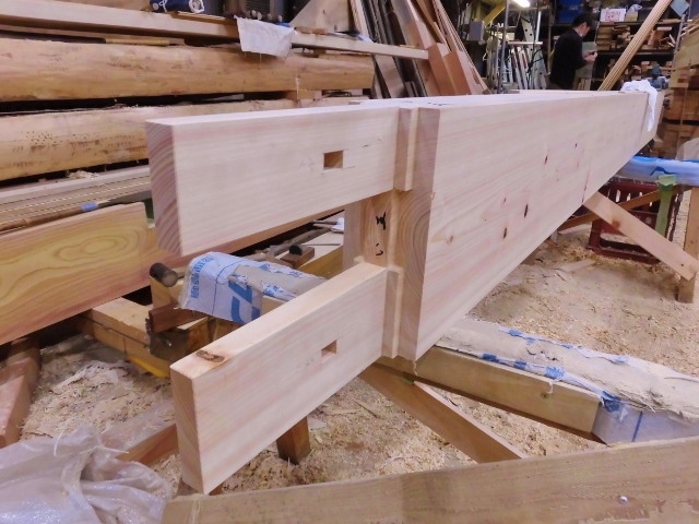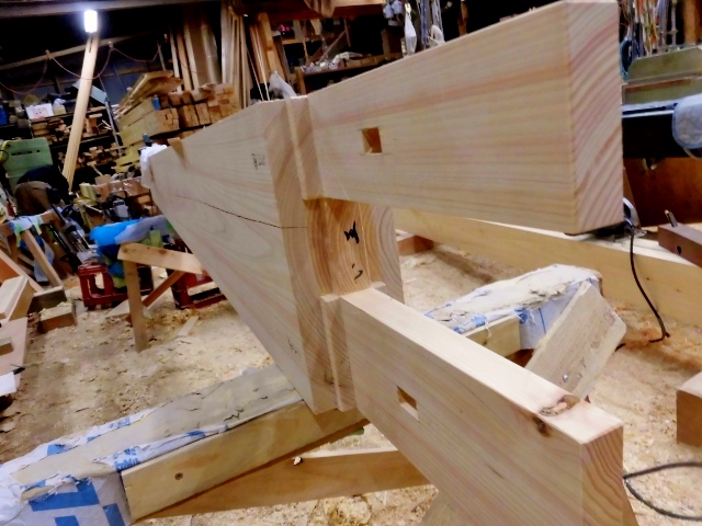 ヒノキ梁刻み5,09 2015.05.09 先代の足あと 今日も皐月晴れの大変良い天気に恵まれ門の刻み作業も順調に進んで来ました、天然 乾燥 させた、尺 ヒノキ材 長ホソ付けて完成です。やはり 完全 天然 乾燥 させた ヒノキ材、良い顔見せてくれます。