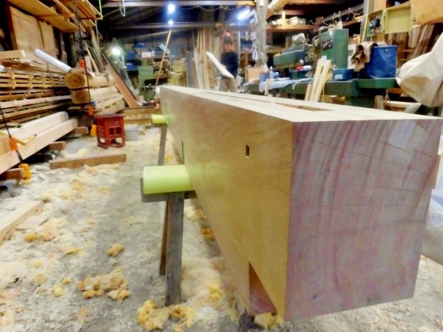 天然乾燥 ケヤキ材 手鉋 仕上げ5,26 2015.05.26 先代の足あと 今日も 夏日の一日でした 工房の中も 真夏日大変暑い 一日でした この暑い中 田中大工 ケヤキ の梁 手鉋 仕上げに 汗 を出して 頑張っています。