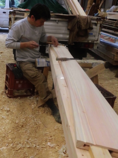 天然乾燥材ヒノキ、破風材 5、28 2015.05.28 先代の足あと 今日も昨日に続き真夏日熱い一日でした。 外も熱いですが工房に中は外に負けない 位暑いです、この暑い中大工菅村天然乾燥 させたヒノキ材で造った破風の加工に精を出して いますやはりヒノキ仕上がり上々です。