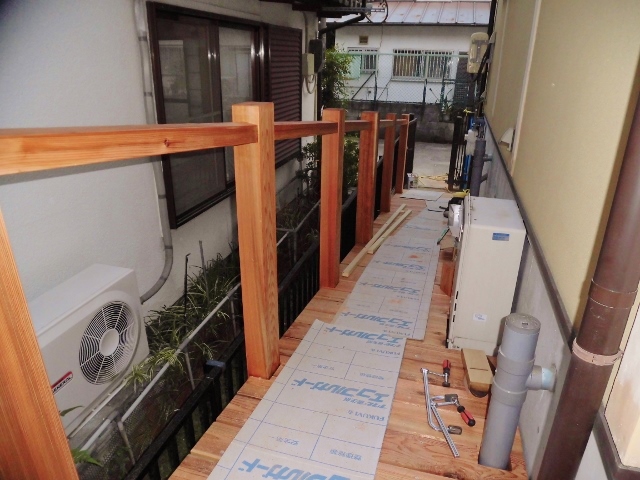 天然乾燥材、赤杉、10,24 2015.10.24 先代の足あと 今日も昨日に続き大変良い日和で外廻りに最高の天気でした 外の作業、赤杉、で制作中のスロープ ベテラン大工 井桜さん 田中さん今日も頑張ってくれています。