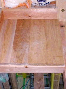 階段踊り場の姿が見えて来ました。ケヤキの40ミリの板なのでしっかりしています。