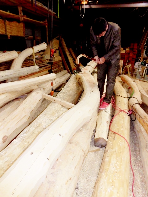 天然乾燥赤松、梁、ハツリ、12,03 2015.12.03 先代の足あと 今日もこの季節一番寒い一日でした。 この寒い日ですが菅村大工さん熱く燃えています。 天然乾燥させた赤松 チョンナ ハツリ、 乾燥すると固くなり ハツリ には力が入り 体全体が温かくなってきます。