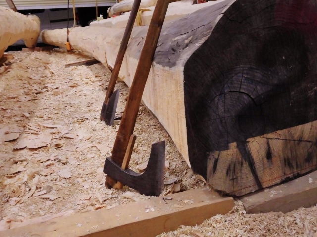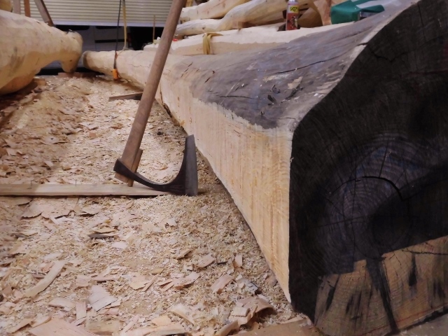 天然乾燥材、赤松ハツリ12,07 2015.12.07 先代の足あと 数年前に寝かせ天然乾燥させた赤松今日から本格的にハツリ 作業の始まりです、昔から受け継がれてきた技術ハツリ作業は 大変ですがやはり昔ながらの良い味出ています、 ハツリ作業が続きその後墨付け作業に移って行きます。