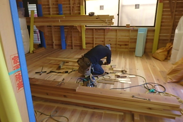 今日も朝から大変良い天気に恵まれ現場作業も順調に進んで来ました。今日の菅村棟梁、造作作業に精をでしています。