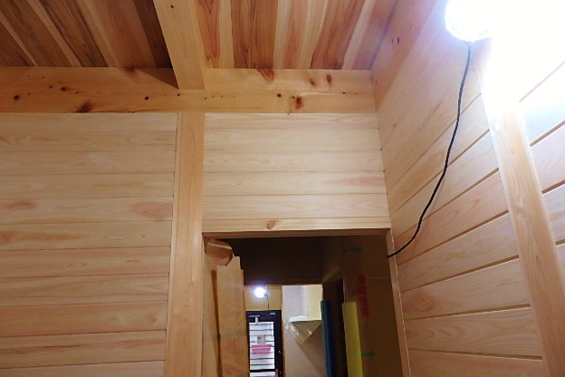 今日も蒸し暑い一日でした。こんな暑い中現場作業も順調に進んで来ました。こんな最終の段階に入った現場作業に大工さん頑張ってくれています。今日は田中大工さん洗面所の壁板張りに精を出していますこのはめいたヒノキの羽目板を使っています。