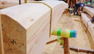 長年天然乾燥させた赤松変木、菅村棟梁、次に建てるお家の梁、墨付け作業に精を出しています。