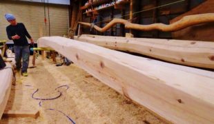 長年天然乾燥させた赤松変木、菅村棟梁、次に建てるお家の梁、墨付け作業に精を出しています。