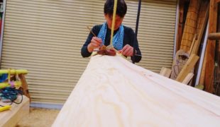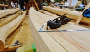 工房の中の気温はいつもより低く少し動きやすい気温でした、菅村棟梁次に建てる曲赤松梁、の墨付け作業に精を出しています。