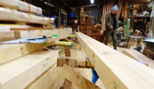 自然素材赤松で建てるお家の丸太梁の刻みもほぼ終わり、赤松平坂の墨付け」作業が続きます。