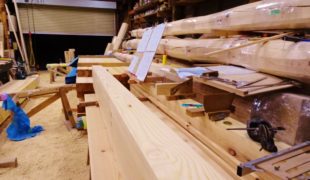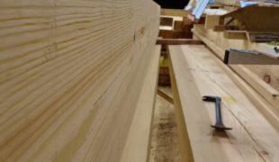 自然素材で建てる木の家、菅村棟梁、天然乾燥させた地松板の墨付け作業に精を出しています。