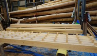 数年間、天然乾燥させたヒノキ柱今日から本格的に加工作業が始まりました。最初の作業クサビ打ちの作業です。