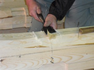 2寸差しノミを使って地松梁刻み 2011.02.07 先代の足あと 2寸の差しノミです。近頃では、あまり見かけない道具です。 やはり日本の家は地松の曲がり梁が似合うと思いますね。 仕事も手刻みが基本ですね。