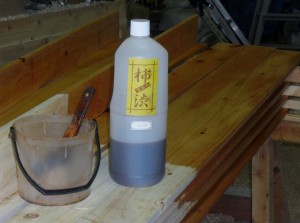 今日はサイデングの下地に使う檜の板に柿渋を塗りました。金物、構造、検査、も無事合格、次の段階に進めます。