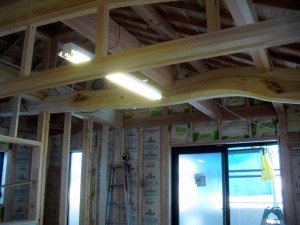 曲がり梁のある家造作進む 2011.05.19 先代の足あと 先月建てたお家の造作が進んでいます。 曲がった地松の梁がいい感じで目立って来ました。 立ち寄られた方も初めてこんなお家を見られて良かったと言ってお帰りになります。