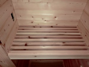 現在改装中の現場の洗面室の壁と天井を さわら の羽目板を張りました。