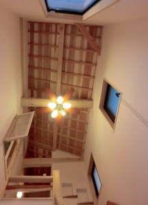 先日引き渡しの終えたお家の吹き抜けの天井に照明の取り付けが出来ました。