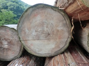 良い出会いを求めて 2011.07.23 先代の足あと こだわりの木材を求めて今日は奈良県川上村へ こんな立派な吉野杉に出会いました。 樹齢250年から300年の杉の材だそうです。 あまりにも立派な姿に圧倒されます。