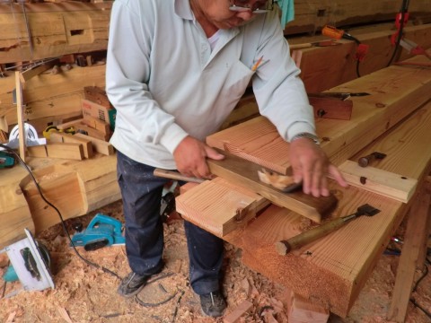 ベテラン 大工さん、今日もマイペース で手刻みで頑張っています。