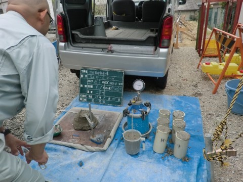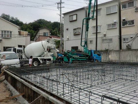 今日は基礎のベースのコンクリート打ちですが天気は曇り、の天気でした。