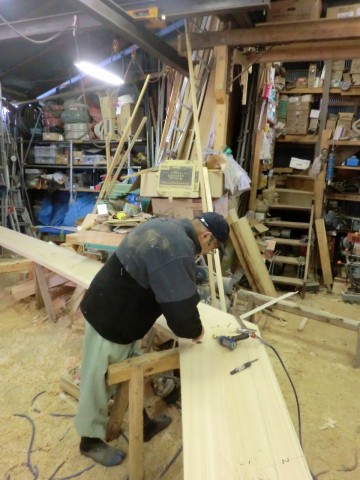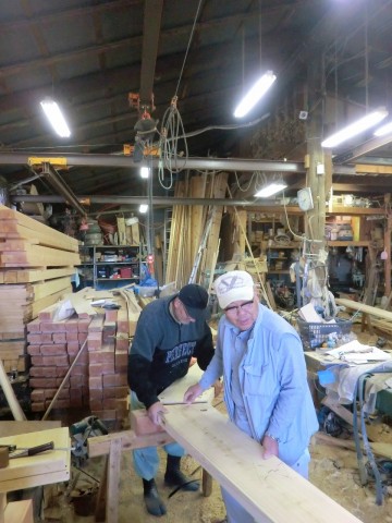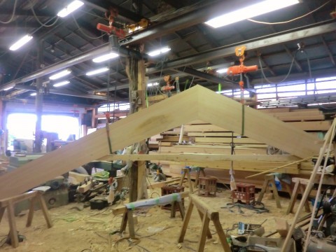 屋根破風仮合わせ 2011.11.16 先代の足あと 屋根の顔である破風の加工と仮合わせ物が大きい為に手間が掛かります。 大屋根の破風は、下屋の破風の倍位あるので仮合わせも大変です。 仮合わせも上手く合い ひと段落 この後 眉書きと移って行きます。
