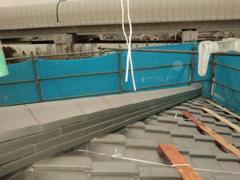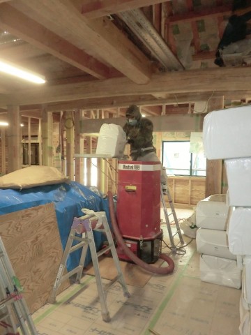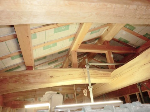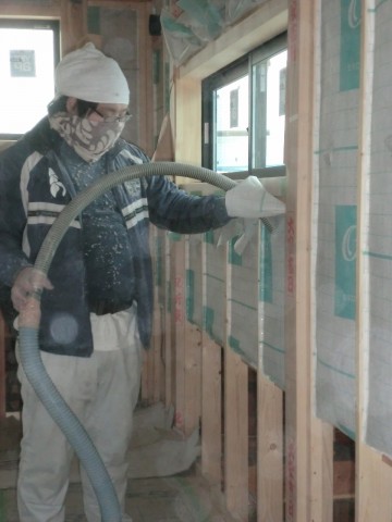 下屋瓦葺き工事終了、セルロース2階部終了 2012.01.24 先代の足あと 今日で下屋部分の瓦葺き工事終了です。 2階部分の透湿フィルムの張りも終わり今日からセルロースの施工開始です。 フィルムの張った中に吹き込み開始です。 午後には作業終了しました。