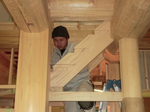 大工さん今日も階段に取り組む 2012.02.17 先代の足あと 大工さん今日も階段取り付けに真剣に取り組んでいます。 この世の中でこれ1つしかない階段なので失敗は出来ません。 なお真剣になり反面燃えていますよー。