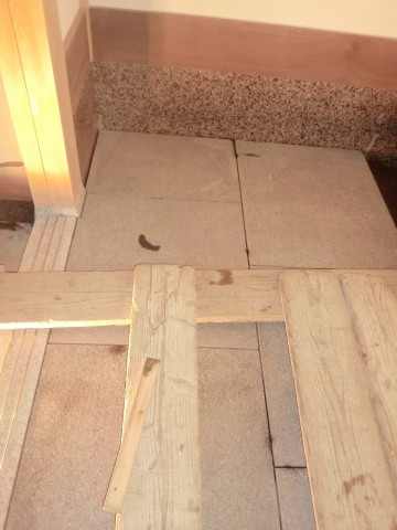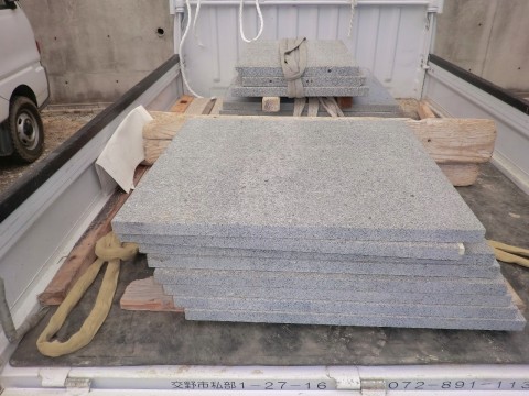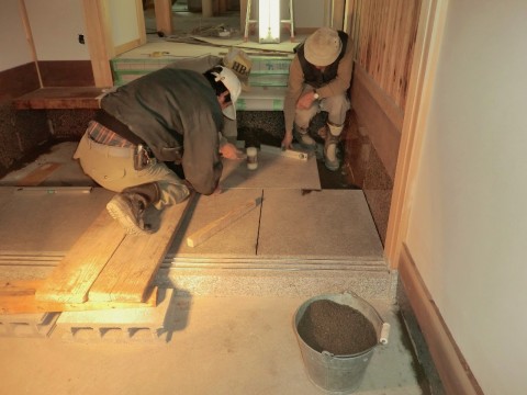 玄関土間石張り 2012.03.15 先代の足あと 玄関に張る石の板に到着です。 土間の張りの途中です。 板の巾と厚さが有る為に大変重く そして張るのも全てが手作業です。 板が大変重く 3人 係で張って行きます。 今日の作業はこれで終了です。