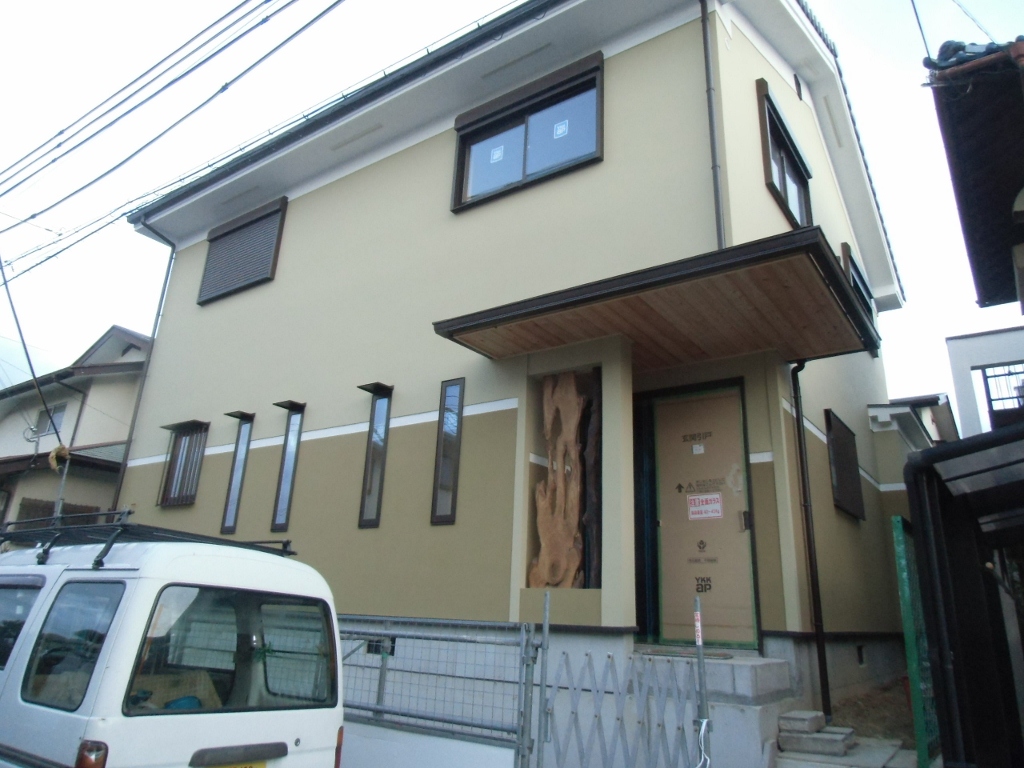 外観完成 2013.01.17 先代の足あと 9月15日に棟上げしたお家の外観が完成しました。 上棟してから5カ月近頃では少し長いですが外壁は すべて左官仕事なのでしかたが無いのではでも サイディングと違い質感は大変良い感じに仕上がりました。