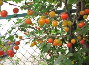作業場のさくらんぼが色ずきはじめました。野鳥は食べ頃をよく知っているようで、見ていると先に食べています。