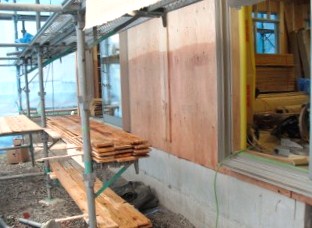 耐力壁に柿渋を塗って防腐処理終了。