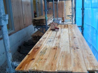 空気層を作る為の下準備、杉小幅板に柿渋を塗っています。
