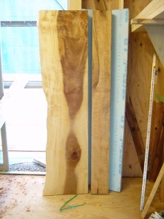 現場に玄関框に仕様する楓、式台に仕様する栃の耳付き板が搬入されました。さてどのような姿になるか楽しみです。