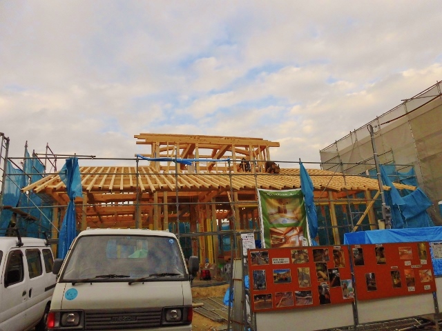 下屋面戸取り付け11,17、 2014.11.17 先代の足あと 今日は月曜日大工さん今日の作業は 土曜日に続き下屋タルキの間に取り付け る面戸板の取り付け作業 数が多い為に 取り付け作業は 捗りません辛抱強く続け ますよー。