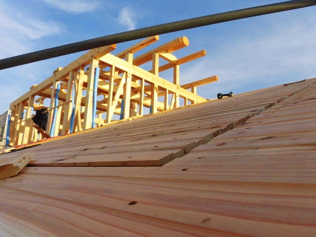 下屋 化粧野地終了11,21 2014.11.21 先代の足あと 今日も良い天気に恵まれ下屋の 化粧 野地 張り無事終了です。 この後40×40 のタルキを取り付け た後12ミリの杉野地を張る 予定です。
